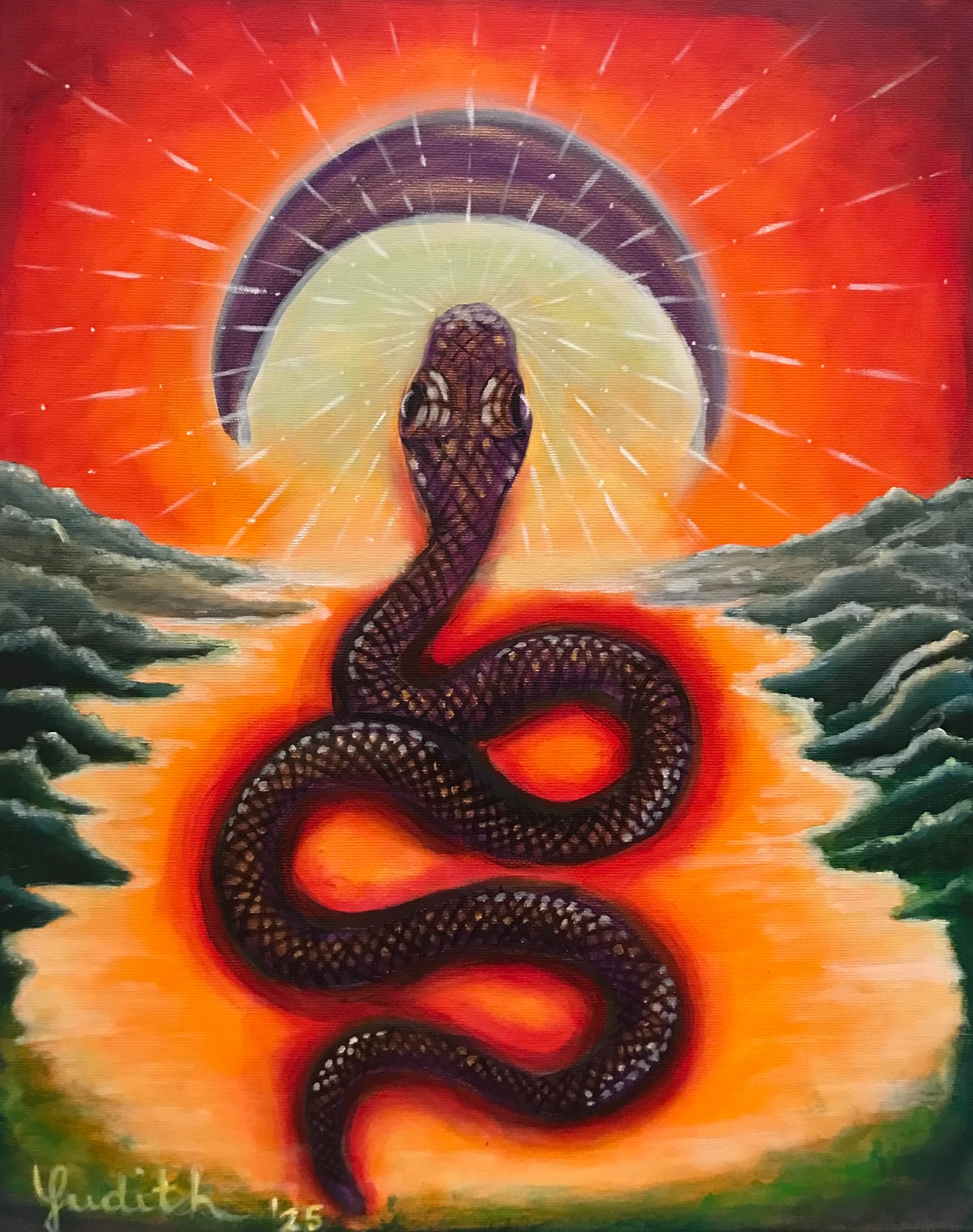 A kígyó évében született festményem hordozza és közvetíti mindazt az energiát, amit ez az év képvisel, a tűz energia szikraként való belobbanását. Szó szerint kilök az álló pontodból, mint amikor gyújtást adsz, és megindítja benned azt a hajtóerőt, ami a Tiéd, de nem használod.